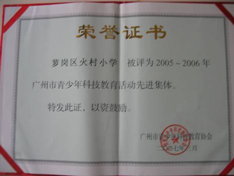 火村小学在萝岗区教育局和基教科领导的指导和关怀下,已形成了明显的学校科技教育特色。随着科技特色项目的扎根深入,科技教育成绩显著。最近,火村小学被评为2005—2006年广州市青少年科技教育活动先进集体.