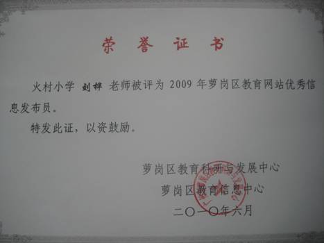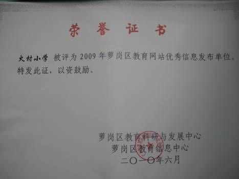 火村小学在萝岗区教育局各级领导的关心和指导下,十分重视学校网站建设,并把网站安全与信息发布工作放在网站工作的首位。最近,火村小学又传来喜讯,在二○○九年火村小学被评为萝岗区教育网站优秀信息发布单位,刘桦老师被评为优秀发布员。
